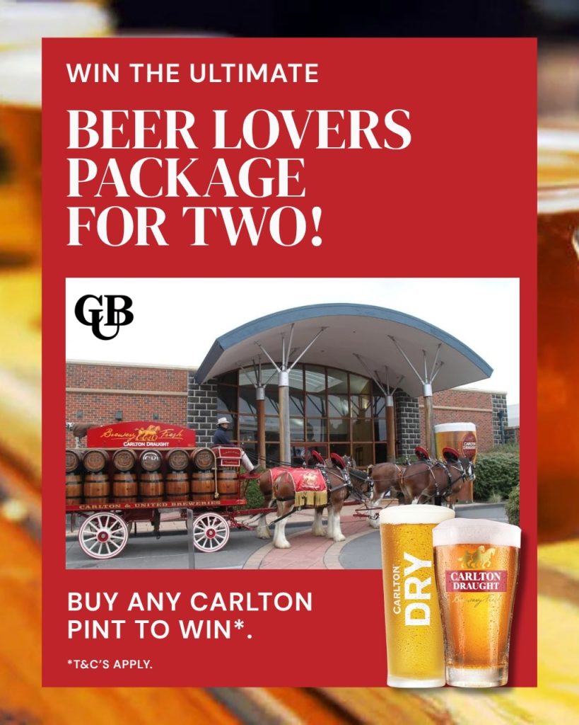 *AU18+ only. Maximum one entry per transaction. Promotion dates: 07/04/2026 – 10/05/2026. To enter, purchase any Carlton pint (Draught or Dry) in venue, complete and submit the entry form. Draw date: 13/05/2026. Drink responsibly. See staff for terms & conditions.